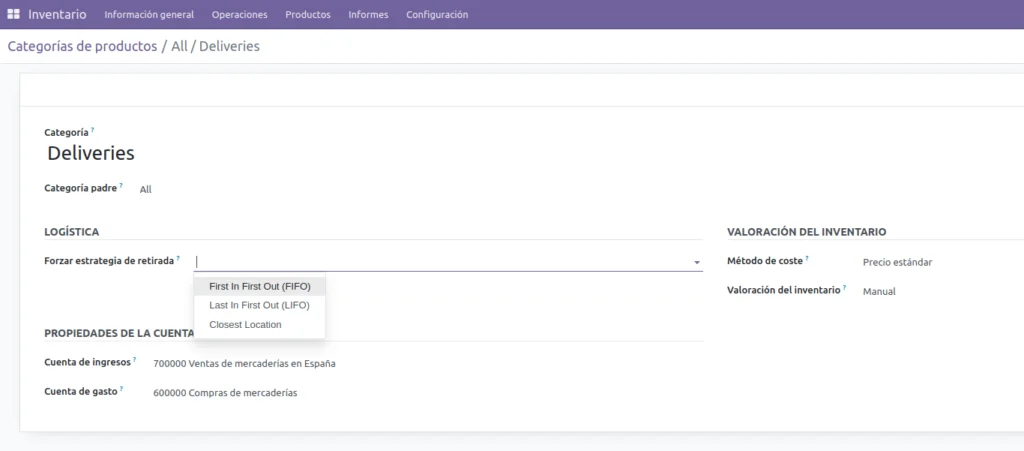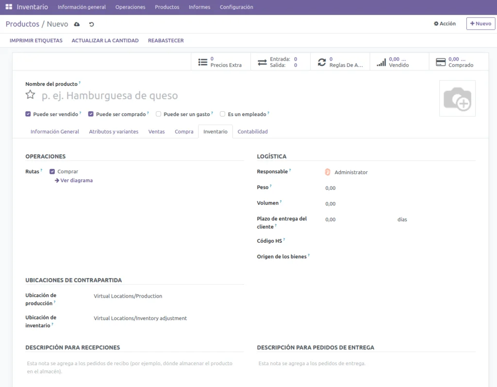 Ubicaciones de inventario: Especifica dónde se almacena físicamente el producto en tus almacenes. Esto ayuda en la organización del espacio de almacenamiento y en la optimización de la logística interna.