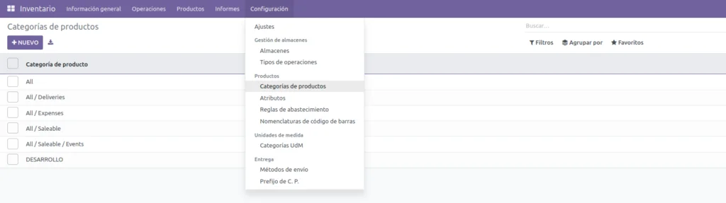 1. En el módulo de «Inventario», selecciona «Configuración» y luego «Categorías de producto».