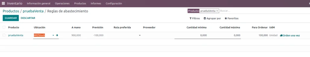 Reglas de abastecimiento: Puedes definir reglas específicas que automatizan la creación de pedidos de compra o de fabricación cuando el nivel de stock de un producto cae por debajo de un umbral predefinido. Esto es especialmente útil para evitar excesos o rupturas de stock.